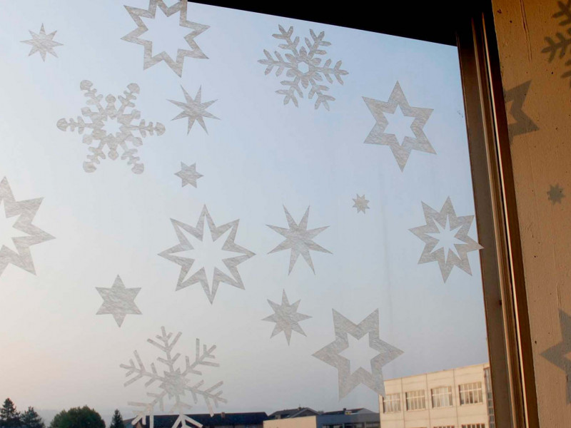 Hafttextil; Unterschiedlich grosse, klassische Sternformen, kombiniert mit filigranen Schneekristallen, verleihen dem Fenster eine stilvolle, winterlich-weihnächtliche Stimmung und erlauben eine spannende und abwechslungsreiche Gestaltung.