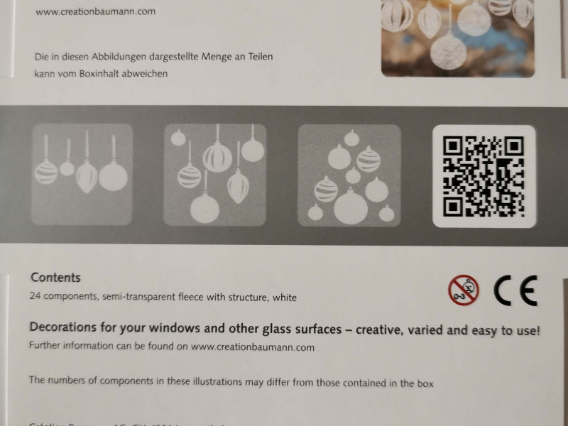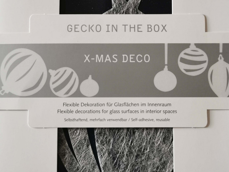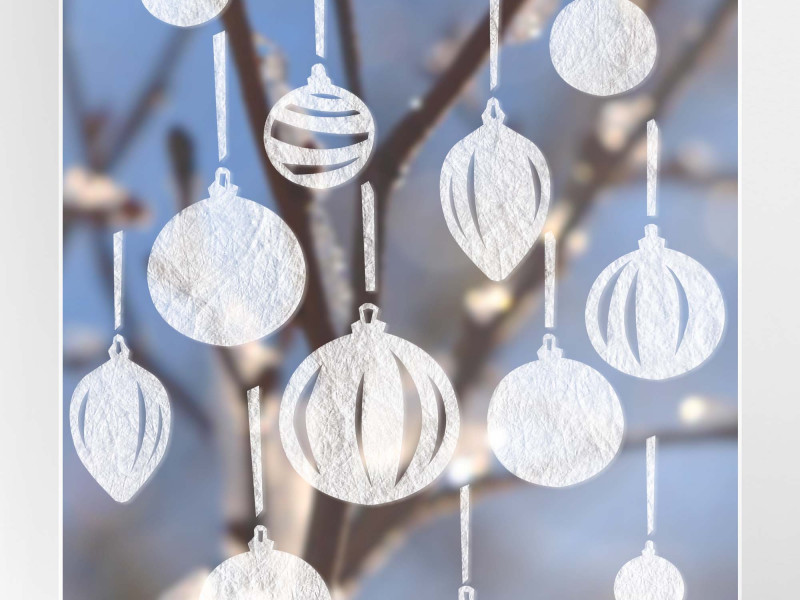 Hafttextil; Unterschiedlich grosse Weihnachtskugeln mit angedeuteter, glitzernder Oberfläche zieren das Fenster und bringen weihnächtliche Stimmung.